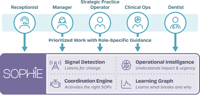 Most dental software records activity or reports outcomes. SOPHIE AI analyzes operational signals and reinforces performance before revenue is impacted.