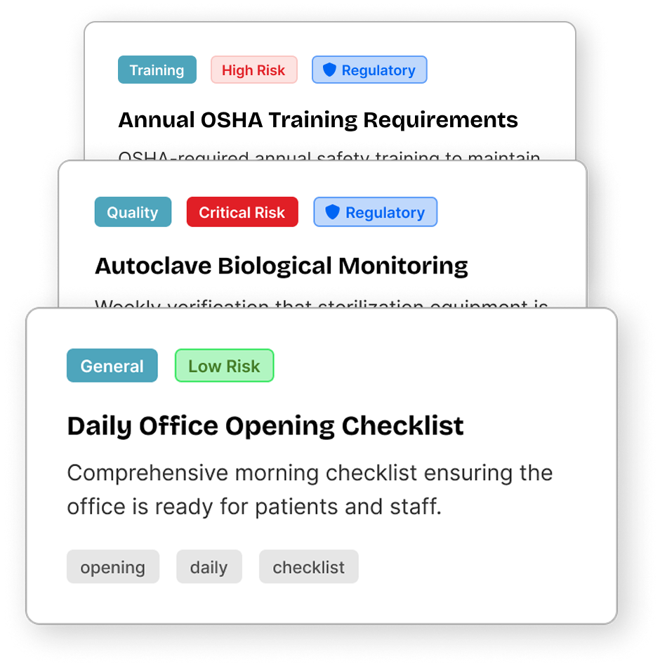 Most practices try to document processes after things break. SOPHIE starts with a complete,role-based systemof standards already mapped to how real dental practices operate. You don’t start from scratch. You start with structure.